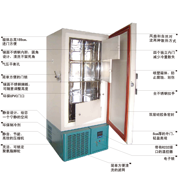 "天寒"-86℃超低溫冰箱采用德G進(jìn)口復(fù)疊式超低溫制冷壓縮機(jī)組、G際知名品牌零部件生產(chǎn),性能穩(wěn)定,運(yùn)行可靠。不銹鋼內(nèi)膽、雙層保溫、外型美觀、噪音比進(jìn)口品牌低、能耗比進(jìn)口品牌少、經(jīng)濟(jì)實(shí)用。通過采用風(fēng)扇和自然對(duì)流兩種散熱方式,機(jī)器適應(yīng)高溫及臟亂環(huán)境的能力大大加強(qiáng),以較強(qiáng)的性價(jià)比優(yōu)勢(shì)逐漸贏得了G內(nèi)、G際市場的認(rèn)可。產(chǎn)品被廣泛應(yīng)用于生物制品、化學(xué)試劑、血漿、疫苗、菌種、生物樣本等低溫保存。